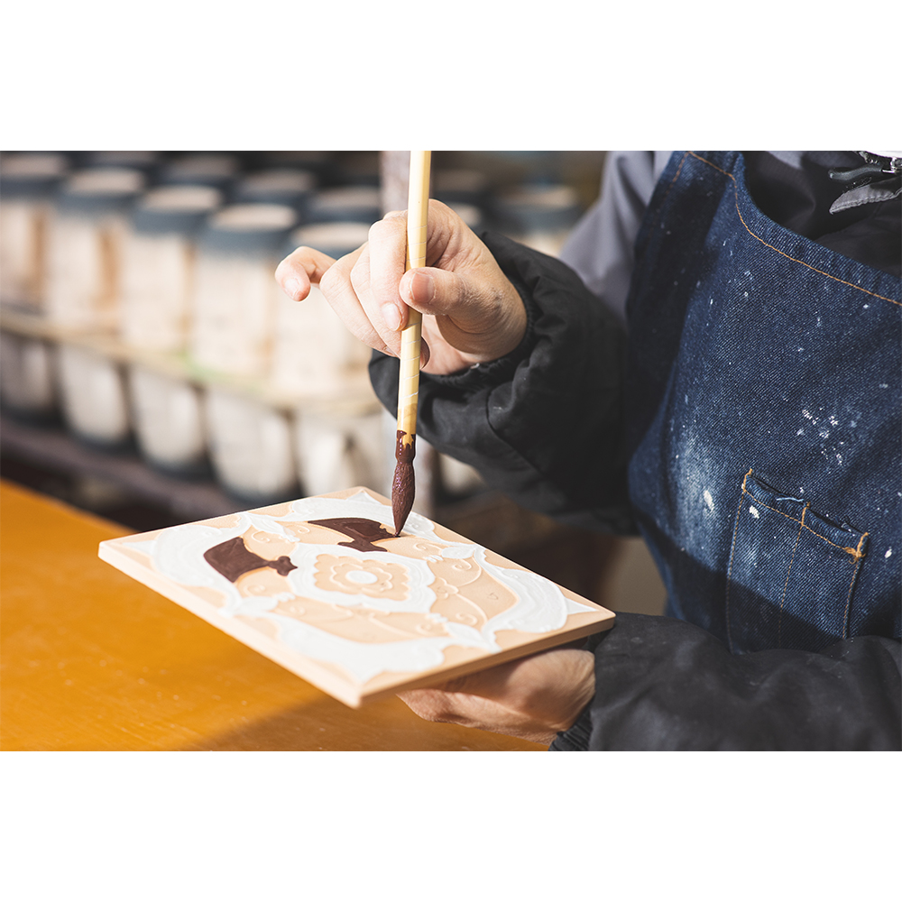 凹凸のレリーフを施したタイル表面に特殊釉薬を手塗りしています。イギリス生まれのマジョリカタイルが日本の技法により現代の美しいタイルとなっています。特注デザインも承ります。