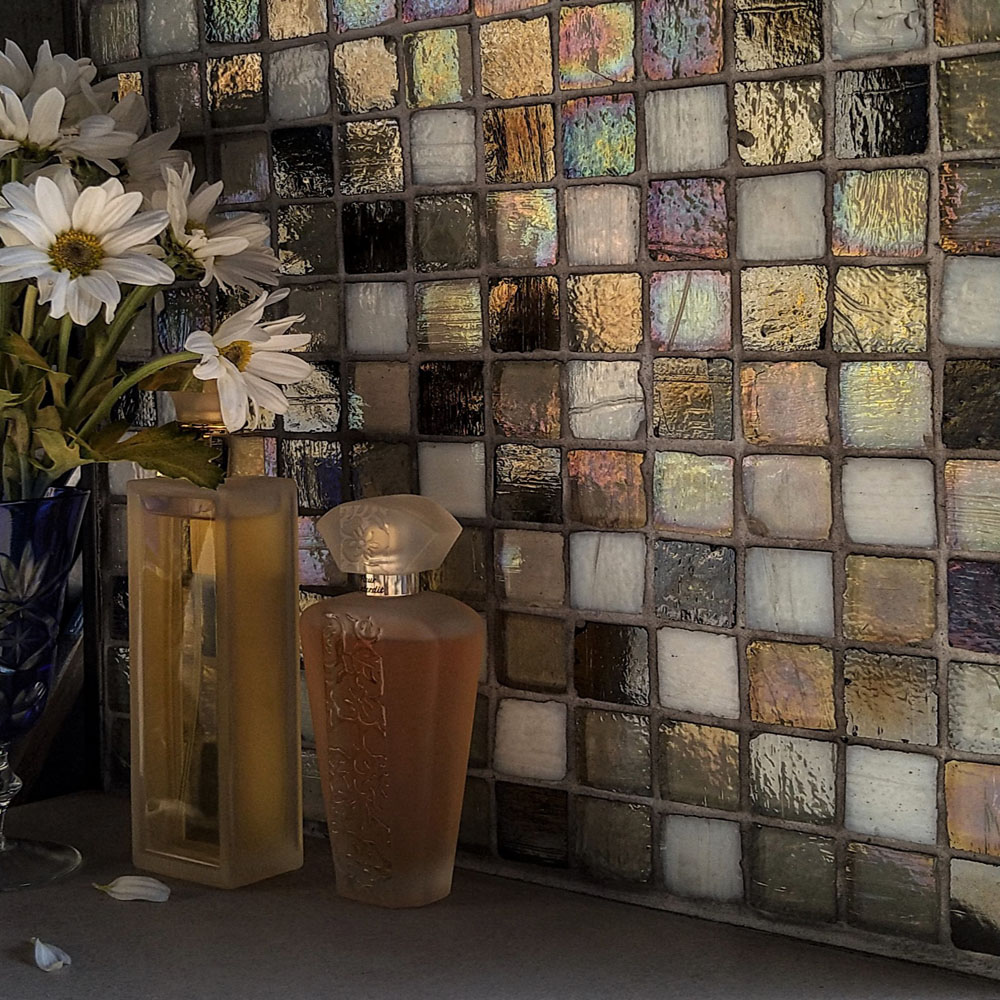 アンティークで透明感のあるステンドグラスを、25mm角のモザイク状にしました。(接着剤張用/注:張付材の色が透けて見えます)