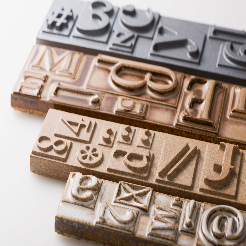 二丁掛~140x40mmサイズの彫刻を施した不思議なタイル。陰影が映える釉薬を厳選し、味のあるビンテージ感を表現。(接着剤張用)