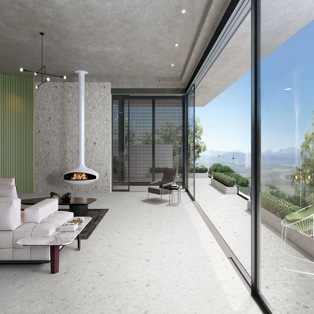 古代ギリシャの砂礫の床を思い起こさせるイメージです。大小さまざまな砂礫がナチュラルでファショナブルな空間イメージを醸し出します。600mm角 (壁:接着剤張/金具工法推奨)