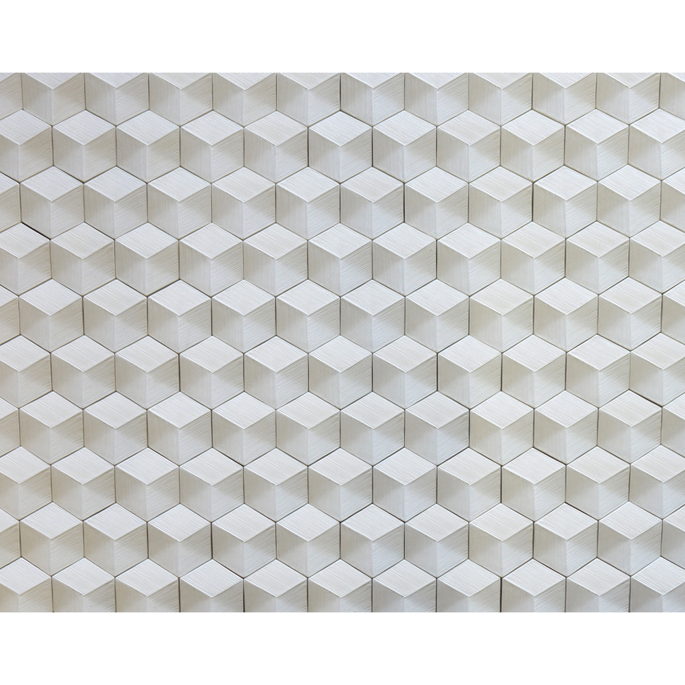 ベースとなる六角フォルムに補助線を加えることで生じるトライアングルパターンをデザインしたモデル。やきものでありながらメタリックな印象を有する。