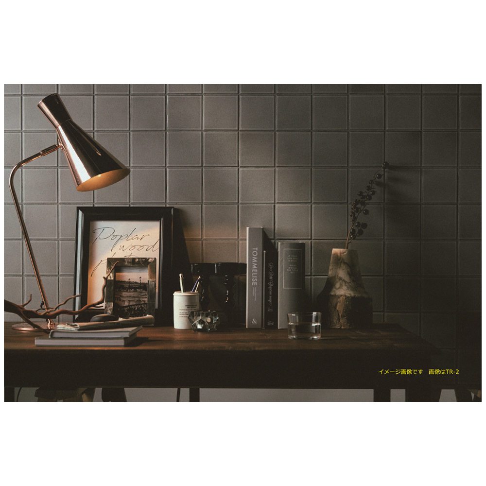 ネイビーやグレーといった深みを帯びたカラーバリエーションの97mm角タイル、硬質なテクスチャー。無機質でありながら、食器を思わせる色合いや手ざわりは時を経るごとに愛着が増します。