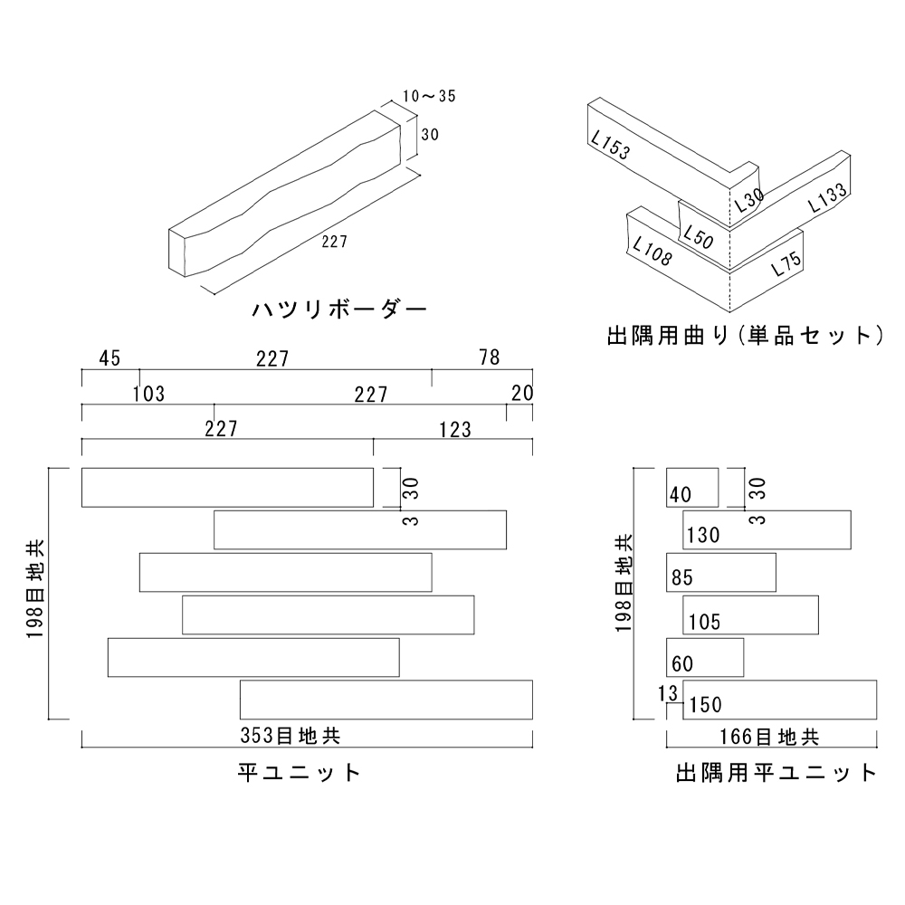 ●ご注文時は在庫・加工納期ををご確認ください。●色合い・寸法・割面状・凹凸感に大きな差の生じる場合があります。●カット面は白く見えるのでご注意ください。●タイル足は蟻足です。タイルの角は尖っているものもあり取り扱いにはご注意ください。●色番2~5はマーブル調になっています。●連結ユニットは目地隙間に連結材(グレー)が見えます。ユニットは目地幅3mmで作成してあります。●ユニットは接着剤張り専用です。●バラ施工のタイルは目地幅縦10mm横8mmで計算しています。●塗り目地はできません