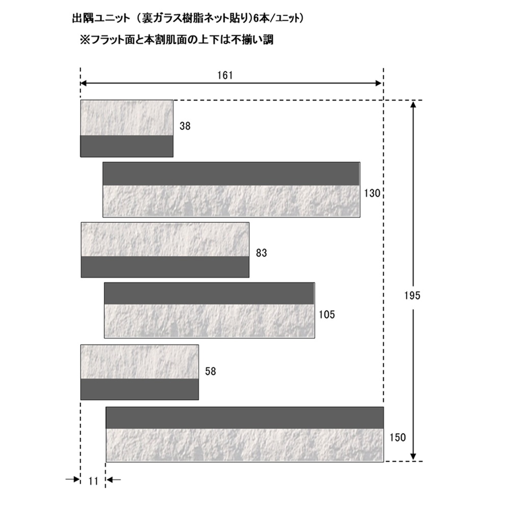 ●ご注文時は在庫・加工納期ををご確認ください。●色合い・寸法・割面状・凹凸感に大きな差の生じる場合があります。●カット面は白く見えるのでご注意ください。●タイル足は蟻足です。タイルの角は尖っているものもあり取り扱いにはご注意ください。●色番2~5はマーブル調になっています。●連結ユニットは目地隙間に連結材(グレー)が見えます。●バラタイルの本数は目地幅縦8mm横10mmで計算しています。ユニットは目地幅3mmで作成してあります。●側面に白い粉のついている場合がありますが品質には問題ございません。●ユニットは接着剤張り専用です。●バラ施工のタイルは目地幅縦10mm横8mmで計算しています。●塗り目地施工はできません。