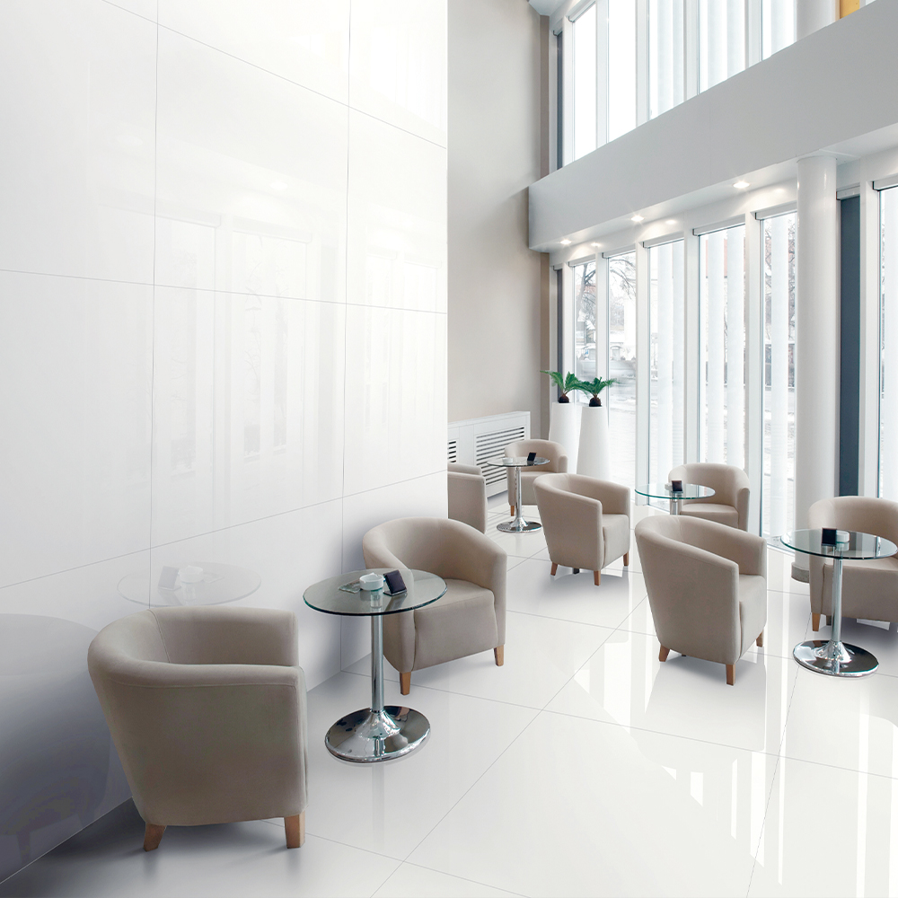 透き通るような純粋な白さの600mm角磨きタイル、空間に清潔感を与えてくれます。(床暖房対応品)