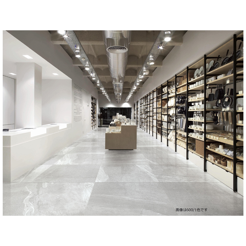 アルプスの麓から産出するライムストーンをモチーフに磁器質タイルとして再現しました。光沢の少ないマットタイプと防滑性の高いアンチスリップタイプがあります。600mm角・1200x600mm 。(壁:接着剤張/金具工法推奨・アンチスリップ仕様があります)
