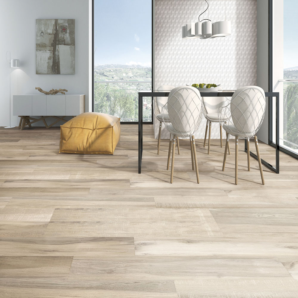 桟橋やデッキの景色を彷彿とさせる表情の1200x200mmサイズのタイルです。そのビンテージ感はいつか見たことのある懐かしさと安らぎを感じます。光沢の少ないマットタイプと防滑性の高いアンチスリップタイプがあります。(壁:接着剤張/金具工法推奨)