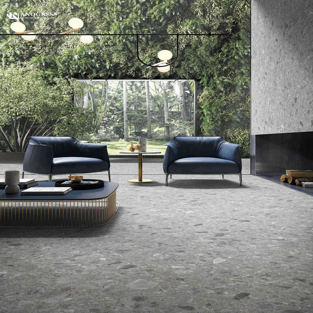 古代ギリシャの砂礫の床を思い起こさせるイメージです。大小さまざまな砂礫がナチュラルでファショナブルな空間イメージを醸し出します。600mm角 (壁:接着剤張/金具工法推奨)