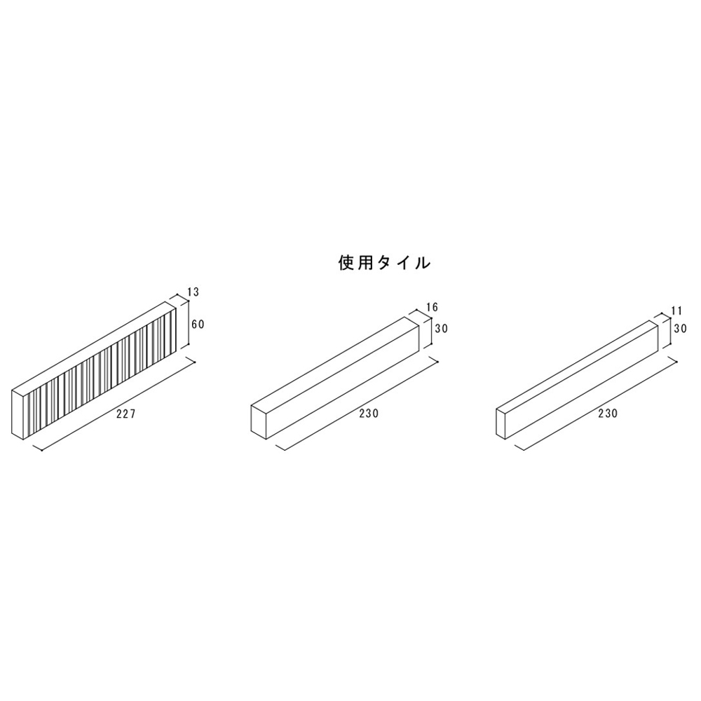 227x60サイズ31枚+230x30サイズ61枚/㎡使用 ■還元色の為広い色幅があり、虹彩現象が生じることがあります。■塗り目地施工はお避けください。寸法バラツキの出ることがありますので通し目地張はお避けください。■接着剤張用の裏足となっております。