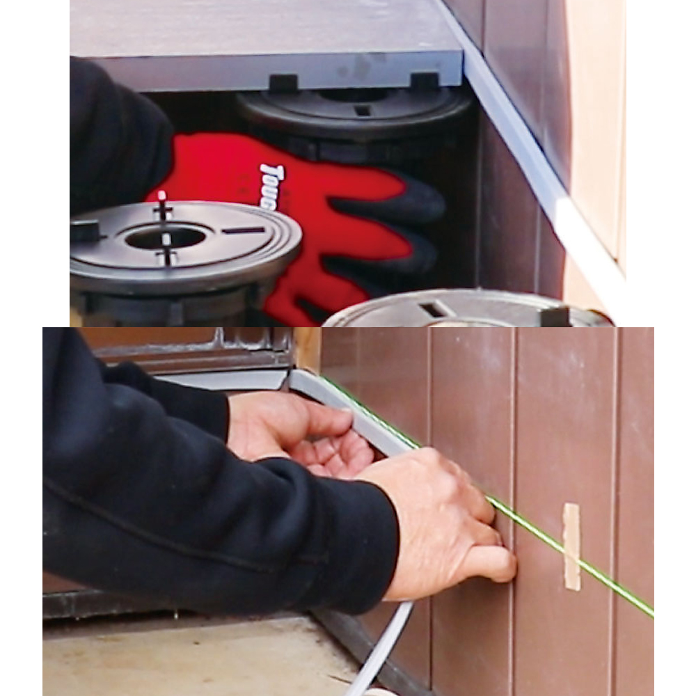 タイル浮き床を容易に製作するシステムです。20mm厚さのタイルを使用して屋外デッキやベランダの他、室内床下配線を可能とするシステムです