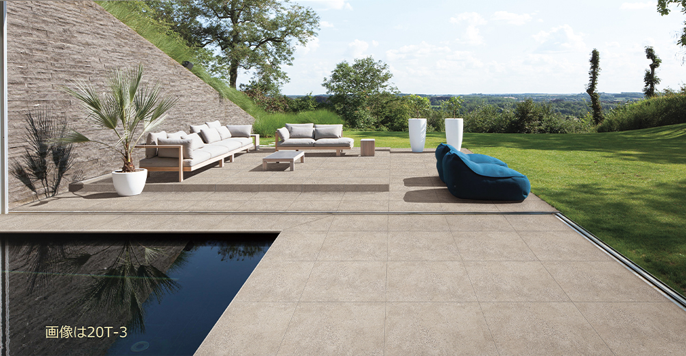 20㎜厚の石材風600mm角タイル。パブリック重歩行エリアからプライベートエクステリアスペースまで幅広くご使用頂けます。(壁:接着剤張/金具工法推奨)