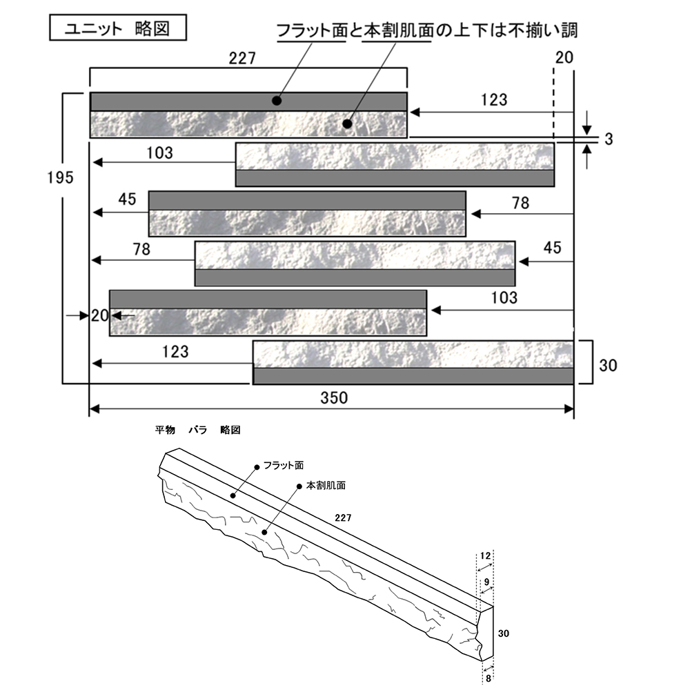 ●ご注文時は在庫・加工納期ををご確認ください。●色合い・寸法・割面状・凹凸感に大きな差の生じる場合があります。●カット面は白く見えるのでご注意ください。●タイル足は蟻足です。タイルの角は尖っているものもあり取り扱いにはご注意ください。●色番2~5はマーブル調になっています。●連結ユニットは目地隙間に連結材(グレー)が見えます。●バラタイルの本数は目地幅縦8mm横10mmで計算しています。ユニットは目地幅3mmで作成してあります。●側面に白い粉のついている場合がありますが品質には問題ございません。●ユニットは接着剤張り専用です。●バラ施工のタイルは目地幅縦10mm横8mmで計算しています。●塗り目地施工はできません。